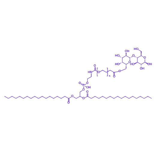 该化合物的分子结构以二硬脂酰基磷脂酰乙醇胺(DSPE)为疏水端,通过醚键连接亲水性聚乙二醇(PEG)链段,末端修饰乳糖分子作为靶向配体,形成稳定的“脂质-PEG-糖类”三嵌段结构。其物化性质表现为在水溶液中可自组装形成纳米囊泡或胶束,平均粒径范围通常在50-200 nm,具有良好的胶体稳定性和生物相容性。在应用层面,乳糖基团可特异性识别细胞表面的半乳糖受体,实现药物的主动靶向递送;PEG链的空间位阻效应能有效减少网状内皮系统的清除,延长血液循环时间。该材料适用于抗肿瘤药物、基因载体及疫苗递送系统的开发,尤其在肝靶向给药领域具有重要研究价值。