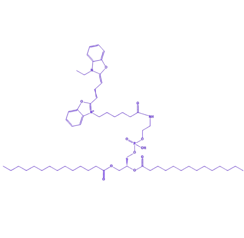 DMPE组分包含两条肉豆蔻酰脂肪酸链,赋予分子强疏水性;磷酸乙醇胺头部则提供亲水性,整体形成双亲性分子结构,可通过疏水相互作用嵌入生物膜系统。菁染料CY2通过共轭体系(含氮杂环结构)实现荧光性能,其高摩尔消光系数与荧光量子产率确保信号强度,激发波长约492nm,发射波长约510nm,具体参数可能随溶剂环境略有波动。