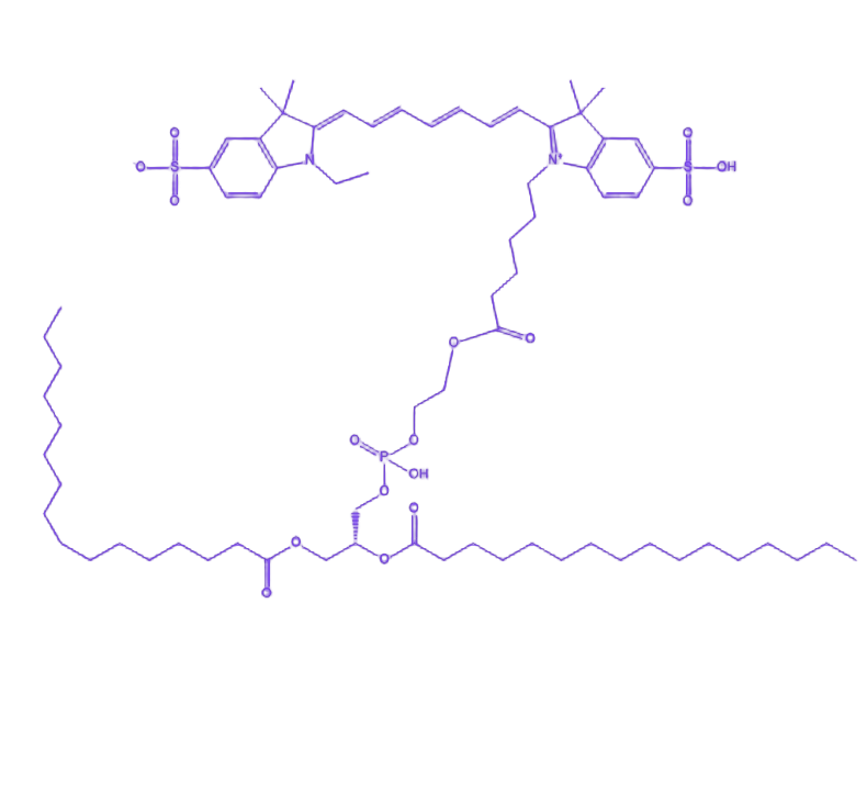 DPPE-CY7 是由二棕榈酰磷脂酰乙醇胺(DPPE)与菁染料 CY7 通过化学偶联形成的两亲性荧光探针。DPPE 分子以甘油酯为骨架,其疏水性尾部由甘油的两个羟基与棕榈酰脂肪酸链连接构成,亲水性头部则通过甘油另一个羟基依次连接磷酸基团和乙醇胺头基,赋予分子典型的两亲结构。CY7 作为近红外荧光染料,其分子内的多个共轭双键体系是产生荧光的核心结构,与 DPPE 结合后仍保留荧光性能,且荧光特性可能受 DPPE 分子结构及连接方式调控。