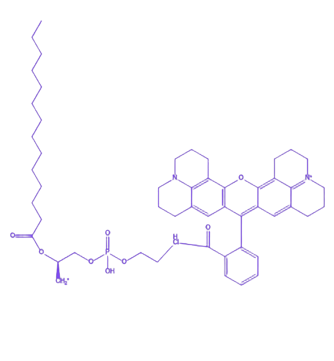 DMPE-ROX是一种由磷脂结构与罗丹明两部分共价连接构成的功能性分子探针,兼具生物膜亲和性与荧光标记特性,适用于生物膜结构研究及动态过程示踪。 磷脂结构单元包含由磷酸基团连接取代基团(含氨碱或醇类)形成的亲水头,以及由脂肪酸链组成的疏水尾。在生物膜环境中,亲水头定向分布于膜表面,疏水尾则嵌入膜内侧双分子层,通过疏水相互作用与静电吸附效应实现对生物膜的高效锚定,展现出优异的生物相容性和膜靶向能力。 罗丹明单元作为荧光发色团,其光学性能受具体化学结构及微环境极性、pH值等因素调控。通常情况下,罗丹明组分的激发波长范围为500-600 nm,发射波长范围为550-700 nm,该光谱特性使其可与常见荧光成像系统兼容,适用于激光共聚焦显微镜、流式细胞仪等平台的生物样本可视化分析。