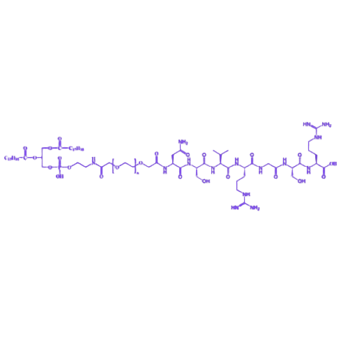 其分子结构中,DSPE 提供亲脂性基团,可与生物膜发生相互作用;PEG 链段则赋予分子良好的水溶性和生物相容性,能显著增加化合物的水溶性并延长其在体内的循环时间,同时增强分子在生理环境中的稳定性,减少降解或非特异性修饰。NSVRGSR 多肽作为功能性配体,可能通过特异性识别并结合细胞表面受体或生物分子,赋予该分子靶向特定细胞或组织的能力。