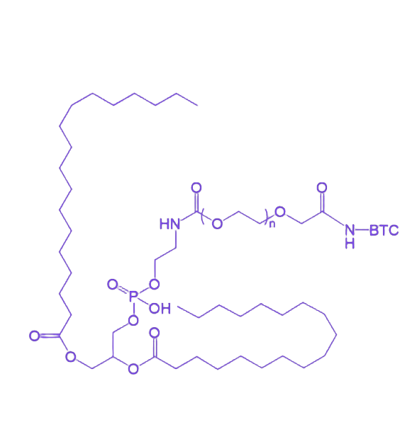 DSPE-PEG-BTC是一种由DSPE(二硬脂酰基磷脂酰乙醇胺)、PEG(聚乙二醇)和BTC三部分核心成分构成的功能性化合物,具备生物相容性、稳定性及靶向调控潜力,适用于生物膜嵌入及生物分子递送等场景。 DSPE(二硬脂酰基磷脂酰乙醇胺)作为磷脂质核心组件,其分子结构包含疏水的磷脂酯尾部与亲水的磷脂酰胆碱头部,这种双亲性特征赋予化合物稳定嵌入生物膜的能力,同时保障了良好的生物相容性和结构稳定性。 PEG(聚乙二醇)作为高分子亲水性修饰单元,可显著提升DSPE-PEG-BTC的水溶性和胶体稳定性,通过空间位阻效应减少网状内皮系统的识别与清除,有效延长化合物在生物体内的循环时间,优化其生物利用效率。 BTC部分作为功能性配体模块,推测为具有特定序列的短肽或生物活性分子,能够通过特异性相互作用与靶标生物分子(如受体、酶或蛋白质)结合,实现对特定细胞或组织的靶向递送,或通过构象调控发挥特定的生物学功能,为精准生物调控提供分子基础。