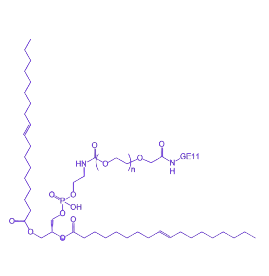 分子结构特性:其分子式为DOPE、PEG与GE11肽三部分的化学结构组合,具体取决于PEG的分子量及GE11肽的氨基酸序列。