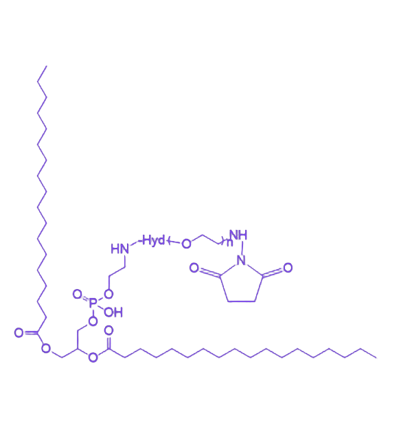 DSPE-Hyd-PEG-NHS 是一种具备智能响应特性的多功能脂质修饰剂,其分子结构由二硬脂酰基磷脂酰乙醇胺(DSPE)通过腙键(Hyd)与聚乙二醇(PEG)连接,并在 PEG 末端修饰 N-羟基琥珀酰亚胺酯(NHS)基团。该化合物集成了脂质结构稳定性、pH 敏感响应、生物相容性提升及生物分子偶联功能,在药物递送、生物成像和基因应用等领域展现出重要应用潜力。