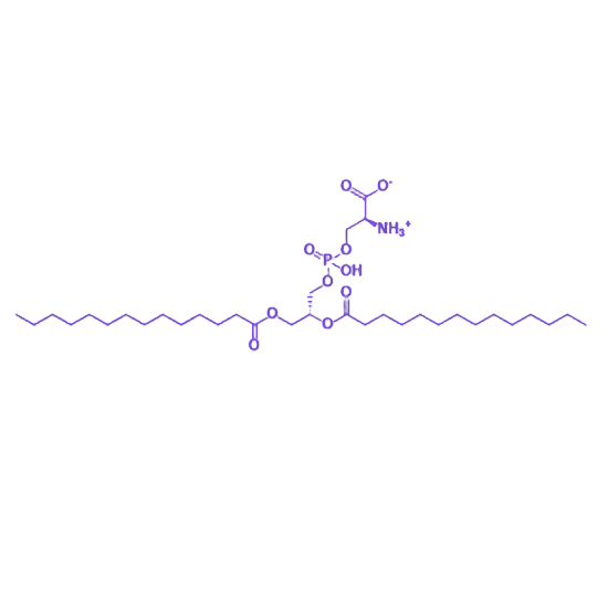 该化合物的化学结构由甘油骨架为核心构成,其中甘油的1,2位羟基通过酯键分别连接两个肉豆蔻酸(十四碳酸)分子,3位羟基则与磷酸丝氨酸形成磷酸酯键。这种结构赋予14:0 PS典型的两亲性特征,即同时具备亲水性头部和疏水性尾部,使其能够参与生物膜的形成并维持膜结构的稳定性。