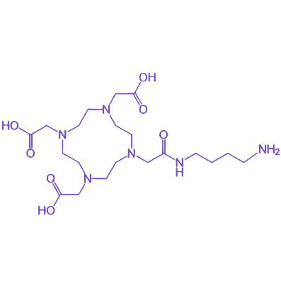DOTA-NH₂是一种兼具金属螯合能力与化学修饰功能的双功能螯合剂,其核心结构基于1,4,7,10-四氮杂环十二烷(DOTA)大环骨架,通过在一个或多个氮原子上引入4-氨基丁基((CH₂)₄NH₂)基团实现功能扩展。DOTA 作为经典大环配体,凭借分子内四个氮原子与四个乙酸基团的协同作用,可与镧系金属离子及部分过渡金属离子形成热力学稳定的络合物,这一特性使其在医学成像、放射性药物研发等领域具有重要应用价值。