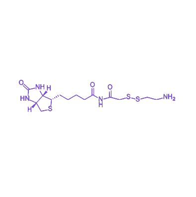 NH₂-S-S-biotin是一种由氨基(-NH₂)、双硫键(-S-S-)和生物素(biotin)组成的功能性分子,其结构设计赋予了多方面的化学与生物学特性。