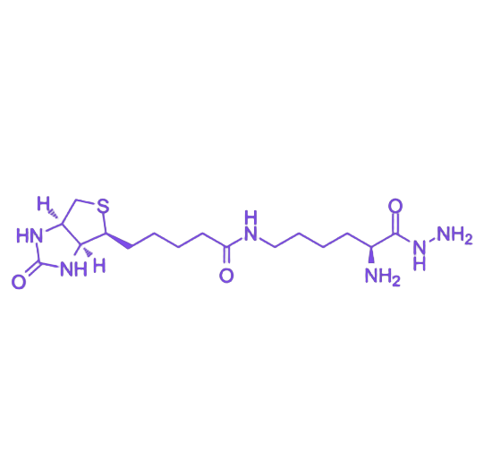 酰肼-生物胞素(Hydrazide-Biocytin)是一种基于生物素衍生结构的活性偶联试剂,其核心结构由生物素(Biotin)、赖氨酸衍生片段(构成Biocytin基体)及可反应的酰肼(Hydrazide)官能团组成。该试剂通过酰肼基团与醛基(–CHO)、酮基(–CO–)的选择性缩合反应形成腙键(Hydrazone bond),实现对糖蛋白、细胞表面糖链等含羰基生物分子的定点生物素化标记,在糖组化学、生物分析及细胞成像领域具有成熟应用价值。 其分子设计以Biocytin为基体,保留生物素的高亲和性与链霉亲和素系统的兼容性,同时引入酰肼官能团作为反应位点,无需依赖氨基或巯基即可完成标记,有效避免对蛋白主链及功能位点的干扰。反应机制基于酰肼-羰基缩合,在温和条件下自发进行,无需额外催化剂,且可通过氰硼氢化钠(NaBH₃CN)还原腙键为更稳定的肼键,满足长时间实验或严格洗涤条件需求。 应用流程通常包括两步:首先采用高碘酸钠(NaIO₄)温和氧化多糖链末端羟基生成醛基,随后加入酰肼-生物胞素实现特异性结合。标记产物可通过链霉亲和素系统进行富集、显色检测、质谱鉴定、磁分选或荧光成像,适用于蛋白糖基化修饰分析、细胞膜糖链分布观察、干细胞表面糖型动态追踪及代谢糖示踪等研究场景。 该试剂具备高选择性、生理条件兼容性及良好水溶性,可直接在水性缓冲液中使用,与细胞、组织切片及蛋白样品兼容。其反应体系无需苛刻条件,兼具操作简便性与结果稳定性,在糖蛋白质组学、细胞成像及生物分析领域展现出独特优势,为糖基化相关研究提供可靠的生物素化工具。