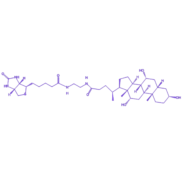 Biotin-cholic acid 是一种融合生物素标记功能与胆酸生物活性的复合化合物,在生物医学研究及新型功能材料开发领域具有重要应用潜力。其通过生物素与亲和素的特异性结合,可实现对含胆酸结构物质的体内代谢过程追踪及信号放大,为探究相关化合物的作用机制提供有力工具;同时,借助生物素的靶向结合特性与胆酸的生理活性,有望开发兼具生物识别与功能应用的新型载体或检测试剂。 该化合物的核心优势在于协同发挥两种组分的独特性能:生物素赋予其高特异性的靶向输送及标记追踪能力,而胆酸作为内源性胆汁酸,不仅参与体内脂肪的消化与吸收过程,其结构特性还可能在调节脂质代谢、改善药物吸收效率等方面发挥积极作用。这种特性组合使得 Biotin-cholic acid 在脂质代谢研究、药物递送系统优化以及生物分子检测分析等场景中展现出多维度的应用价值,为相关领域的基础研究与应用开发提供了创新思路。
