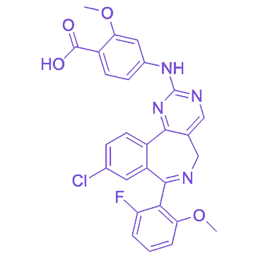 Alisertib是一种口服可用的选择性极光激酶A抑制剂,具有潜在的抗肿瘤活性。其作用机制为通过与极光激酶A结合并抑制其活性,干扰有丝分裂纺锤体装置组装,导致染色体分离异常,进而抑制细胞增殖。在细胞实验中表现出对极光激酶A的高选择性和强活性,无细胞试验中IC50值达1.2 nM,对极光激酶B的选择性高于200倍。