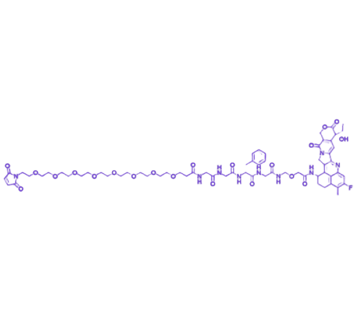 其分子结构由四个功能单元构成:Mal 反应柄作为连接抗体的锚定基团,通过与硫醇(-SH)的特异性反应形成稳定共价键;PEG8 间隔臂(含八个乙二醇重复单元)赋予分子亲水性与空间柔性,可减少非特异性蛋白/膜吸附并隔绝外部蛋白酶的误切割;Gly-Phe-Gly-Gly 四肽连接子为细胞内溶酶体蛋白酶的特异性底物,确保药物在靶细胞内环境中高效释放;DXD 载荷作为拓扑异构酶 I 抑制剂,通过抑制 DNA 复制发挥细胞毒性作用。
