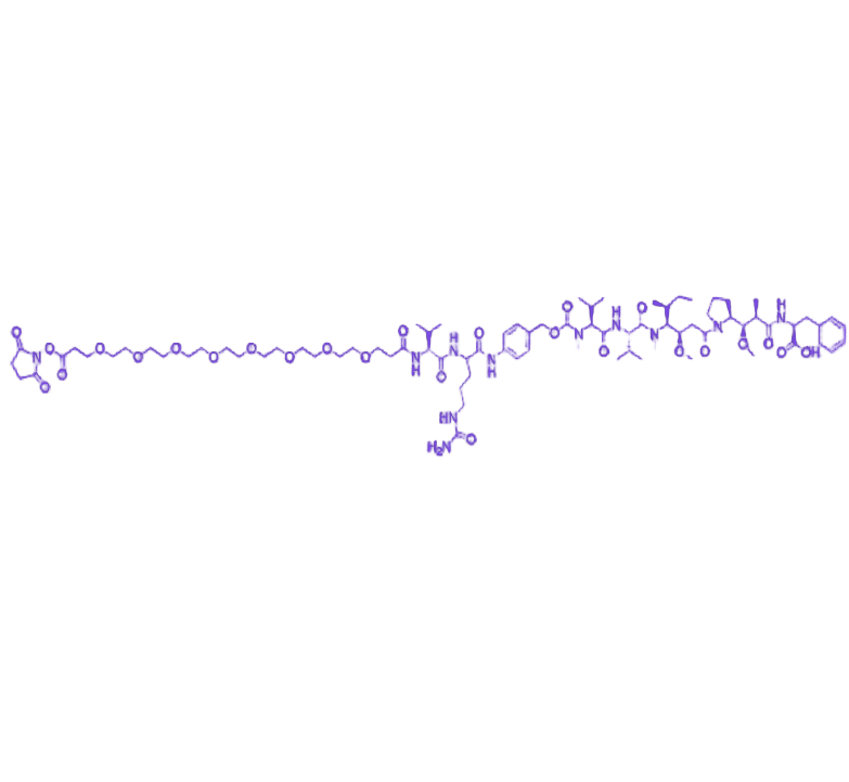 其分子结构由多个功能模块依次构建:NHS 作为反应活性基团,可与抗体或蛋白质分子上的伯胺基团特异性结合,通过形成稳定的酰胺键完成偶联;PEG8(八聚乙二醇)链段作为亲水性间隔臂,显著提升分子的水溶性、柔性及生物相容性,降低空间位阻对抗体抗原结合位点的干扰,延长药物在体内的循环时间并增强稳定性;Val-Cit(缬氨酸-瓜氨酸)二肽作为酶敏感连接单元,在靶细胞溶酶体中可被组织蛋白酶 B 特异性识别并切割,继而触发 PAB(对氨基苯甲醇)的自我消除反应,确保 MMAF 在细胞内定点释放。