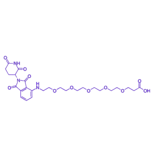 Pomalidomide 4'-PEG5-Acid 是泊马度胺的功能化衍生物,通过在4'位点引入五单元聚乙二醇链段并修饰末端羧酸基团,实现了亲水性与反应活性的协同优化,为生物分子偶联及多功能载体构建提供高性能化学工具。 该分子以 泊马度胺(Pomalidomide) 为核心母核,通过精准的4'位点化学修饰引入 五单元聚乙二醇(PEG5) 链段。PEG5链段的引入显著提升了分子的亲水性和水溶性,同时提供了适宜的空间距离与分子柔性,既保障了母核结构的稳定性及生物学特性,又为后续偶联反应构建了理想的化学平台。末端修饰的 羧酸(–COOH) 基团可在温和反应条件下与氨基或羟基发生酰胺化、酯化等反应,满足抗体、多肽、纳米载体等多种生物分子的定点修饰需求。 产品适用于 分子成像探针开发、纳米递送系统构建及生物材料表面功能化修饰等研究领域。通过核磁共振(NMR)、质谱(MS)及高效液相色谱(HPLC)等多维度分析手段,对产品结构及纯度进行严格质控,确保满足科研实验及工业化生产的高标准要求。