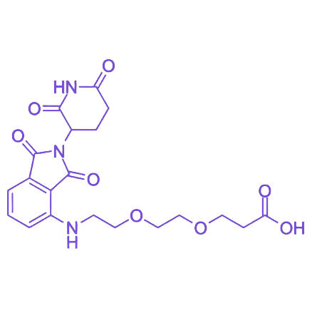Pomalidomide-PEG2-Acid 是一种以 Pomalidomide 为核心骨架,通过 二聚乙二醇(PEG2) 短链连接末端羧基的功能化小分子,兼具生物活性与化学修饰能力,设计初衷是在保留核心骨架化学特性的基础上,为后续生物偶联及分子修饰提供稳定反应位点。