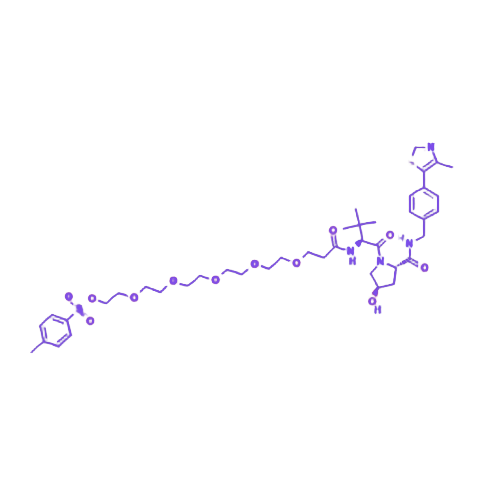 (S, R, S)-AHPC-PEG6-Tos 是一种基于VHL(von Hippel-Lindau)蛋白配体的 PROTAC连接子,由(S, R, S)-AHPC手性配体、六聚乙二醇(PEG6)柔性链段及对甲苯磺酰基(Tos)功能基团组成,主要用于构建靶向蛋白降解剂(PROTAC),在靶向蛋白降解研究中提供灵活的化学设计空间。 其分子结构中,PEG6链段可显著增加分子亲水性,提升在水性介质中的溶解度,同时有效降低非特异性结合,优化PROTAC分子的理化性质。Tos基团作为高活性离去基团,能通过亲核取代反应等多种偶联方式,实现与靶蛋白配体的高效连接,为PROTAC分子的合成提供关键化学位点。 该化合物通过募集E3连接酶(如VHL)与靶蛋白配体偶联,形成稳定的三元复合物,进而诱导靶蛋白泛素化降解,在需要精细调控连接子长度、优化化学稳定性及提升降解效率的PROTAC设计场景中具有重要应用价值。
