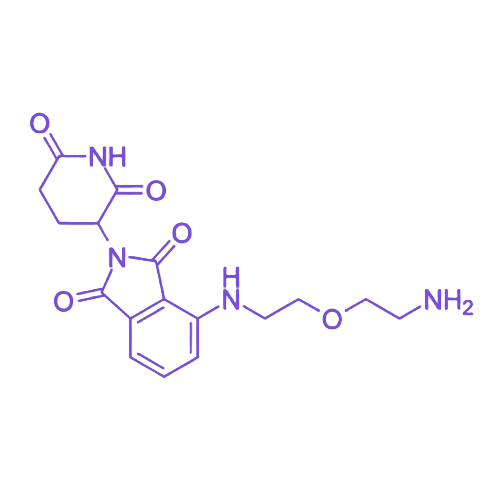 该衍生物以 Pomalidomide 为母体结构,在 4' 位通过 PEG1 连接臂(单分子量聚乙二醇片段)修饰,末端带有可反应的 伯胺基团。PEG1 连接臂的引入在提升分子水溶性和反应位点暴露度的同时,保持了连接臂长度的最小化设计,确保分子功能化后仍维持紧凑构象,适用于空间位阻要求较高的体系。