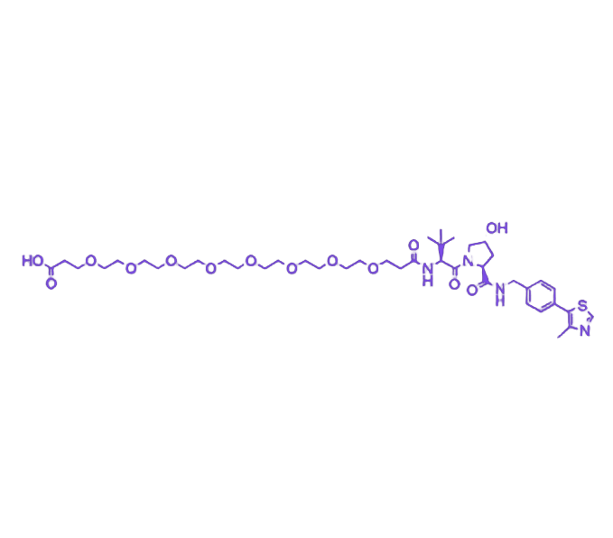 其核心结构设计聚焦于提升 PROTAC 分子的组装效率与功能特性:AHPC 配体通过特异性结合 VHL E3 连接酶实现泛素化系统招募,PEG8 间隔臂赋予分子优异的 亲水性柔性,为 AHPC 与目标蛋白配体之间提供充足的空间缓冲,有利于三元复合物的形成;末端羧酸基团可通过酰胺键等方式与含胺基的目标配体或 warhead 端高效偶联,确保合成反应的活性与特异性。