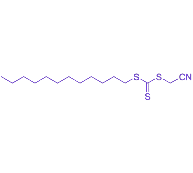 (氰甲基)十二烷基三硫代碳酸酯是一种结构传统且性能优异的三硫代碳酸酯类RAFT链转移剂,其分子结构由氰甲基基团、三硫代碳酸酯活性中心和十二烷基链构成,兼具良好的自由基调控能力、有机相容性和疏水性,在RAFT聚合领域具有普适性和可控性,可用于合成结构明确的聚合物及构建先进纳米材料。 分子结构设计体现出高度的科学性与功能性:一端的氰甲基基团作为强吸电子基团,能够有效稳定聚合过程中形成的自由基中间体,为链增长的可控性提供核心保障;中间的三硫代碳酸酯活性中心是实现可逆链转移反应的关键功能单元,直接决定了其在RAFT聚合中的调控效能;另一端的十二烷基长链则赋予试剂良好的有机相容性和疏水性,拓宽了其在不同溶剂体系中的应用范围。 在聚合应用中展现出广泛的单体适用性和优异的调控效果,对苯乙烯、甲基丙烯酸甲酯等常见乙烯基单体,以及丙烯腈等含强极性基团的单体均能实现有效控制,可获得分子量分布窄、结构明确的聚合物产物。与羧基封端的RAFT试剂相比,其聚合物末端为氰甲基,为材料功能化提供了独特途径,该基团具有一定化学活性,可在较温和条件下通过与伯胺或仲胺的亲核取代反应引入氨基,或经还原反应转化为氨基甲基、水解反应生成羧甲基,实现聚合物末端性质的灵活切换。 十二烷基长链的存在使其在非极性或中等极性溶剂中表现出更佳的适配性,特别适合合成全疏水性或含大疏水嵌段的聚合物。这类聚合物在选择性溶剂中可自组装形成胶束、囊泡等纳米结构,在药物控释、纳米反应器等领域具有重要应用潜力。同时,氰基自身的极性和潜在配位能力,使由此制备的聚合物在吸附分离、催化载体等领域展现出独特的应用价值,是RAFT聚合基础研究及功能聚合物合成的可靠选择。