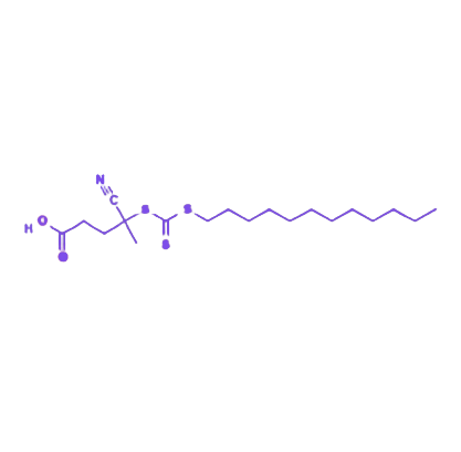 4-氰基-4-[(十二烷基硫代羰基)硫代]戊酸是一种高性能的RAFT链转移剂,在现代高分子合成化学中占据核心地位,其精巧的分子结构赋予了卓越的聚合控制能力和功能拓展性,可广泛应用于生物医学与材料科学等领域。 该化合物分子结构设计包含三个关键功能单元:一端为强吸电子基氰基,能够有效稳定聚合过程中的自由基中间体;中间为三硫代碳酸酯关键官能团,通过可逆加成-断裂链转移机制实现聚合反应的精准调控;另一端由长链十二烷基疏水尾与羧酸亲水头构成,兼具溶解性调节与后修饰功能。这种结构特征使其在RAFT聚合中表现出优异的控制能力,可制备分子量分布窄(PDI可低至1.1)、结构明确的功能聚合物,与普通引发剂相比能显著抑制链终止与转移反应,实现“活性”聚合特征。 末端羧基为聚合物链提供了便捷的修饰位点,可通过酰胺化、酯化等化学反应引入靶向基团、荧光标记或交联位点,大幅拓展了材料的功能性。在应用方面,该试剂在生物医学领域可用于合成智能药物载体、响应性水凝胶;在材料科学中可用于制备高性能涂料、胶粘剂及纳米复合材料。此外,该试剂在温和条件下具有良好稳定性,操作简便,与多种单体(如丙烯酸酯类、苯乙烯、丙烯酰胺等)兼容性强,是实验室研发和工业应用中实现高分子精密结构设计的理想工具,推动了从基础研究到产业化材料的跨越。
