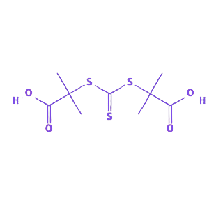 该化合物的核心功能在于通过 可逆加成–断裂链转移机制 实现对聚合链增长速率、链长分布与聚合物端基结构的精准调控,其分子结构中含有的两个对称羧酸端基使其兼具链转移与功能化接枝双重特性。羧酸基团可通过酰胺化、酯化或 EDC/NHS 等偶联试剂介导的反应,实现与有机小分子或高分子链段的共价连接,进而构建 嵌段、梳状、星型 或端基功能化聚合物,尤其适用于合成末端带 –COOH 的对称型或双臂聚合物。其三硫羰基结构赋予聚合物特有的 RAFT 活性端基,支持后续链延伸、区段聚合及端基转化反应(如与胺类或亲电试剂的化学反应),但该结构对热、光、氧较为敏感,需在避光、低温条件下储存以保持稳定性。