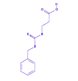 分子结构由苄硫基、三硫羰基及末端羧酸基团(–COOH)构成,其中三硫羰基赋予可逆加成–断裂活性,苄基结构增强与电子中等富集单体(如丙烯酸类)的适配性,羧酸基团则提供后修饰位点。三硫羰基通过可逆加成–断裂机理在自由基聚合中形成稳定休眠链端,有效减少链终止反应,实现对聚合物分子量的精确控制;苄基结构提升与多类单体的兼容性,尤其适用于丙烯酸酯、甲基丙烯酸酯及丙烯酰胺体系;末端羧酸基团可通过EDC/NHS体系与氨基化分子进行酰胺偶联,或通过酯化反应实现表面固定化,支持端基功能化高分子、嵌段共聚物及刷型聚合物的构建。