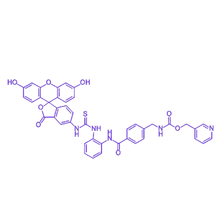 FITC作为常用的荧光标记试剂,可与多种生物分子结合,适用于生物样本的荧光成像与动态追踪;恩替诺特是一种具有明确抗肿瘤活性的组蛋白脱乙酰酶(HDAC)抑制剂,通过调节组蛋白乙酰化水平发挥抗肿瘤作用。该化合物通过化学键合实现FITC与恩替诺特的稳定连接,既保留了FITC的荧光特性,可用于实时监测化合物在生物体内的分布与代谢过程,又维持了恩替诺特的HDAC抑制活性,确保其抗肿瘤功效。FITC-MS275为肿瘤治疗机制研究、药物递送系统开发及活体成像实验提供了一体化工具,尤其在抗肿瘤药物筛选与靶向治疗研究领域展现出独特优势。
