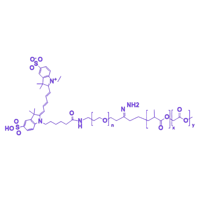 该材料的近红外荧光特性源于 Cy5 染料,可在生物成像中提供稳定的荧光信号,支持实时追踪与定位;PEG 链段赋予材料优异的水溶性和生物相容性,能有效降低非特异性蛋白吸附,延长其在生物体内的循环时间;腙键作为关键的刺激响应单元,在酸性微环境(如肿瘤组织或细胞内吞体)中发生水解断裂,触发负载物的精准释放;PLGA 骨架则通过调控降解速率实现药物或活性成分的缓释控制,且最终降解产物为乳酸和羟基乙酸,可被生物体自然代谢,无毒性残留。