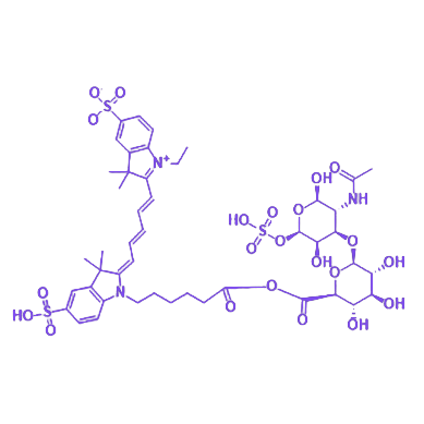 该复合物通过共价键将 Cy5 稳定连接于硫酸软骨素 A 的糖链结构,形成均一性分子实体。这种结构设计使探针在保留 Cy5 荧光参数(如 Stokes 位移、摩尔消光系数)的同时,继承硫酸软骨素 A 与生物大分子(如生长因子、受体蛋白)的特异性相互作用能力,可应用于活体成像、药物递送追踪及细胞外基质动态分析等研究场景。其化学稳定性与生物安全性经优化后,适用于细胞水平至整体动物层面的多尺度实验体系。