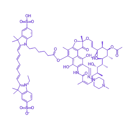 Cy7-RIF 是由近红外荧光染料 Cy7 与抗生素利福平通过化学方法偶联形成的功能性化合物,兼具 Cy7 的荧光标记特性与利福平的抗菌活性,为生物医学研究及化合物研发提供了多维度应用工具,尤其在利福平体内过程及作用机制研究中具有独特价值。 Cy7-RIF 的核心组分包括 Cy7 与 利福平。其中,利福平作为经典抗生素,对多种 细菌 表现出显著抗菌活性;Cy7 是一种近红外花青素荧光染料,其荧光发射波长位于肌体 近红外窗口 I 区域,该区域具有肌体血液、体液背景荧光干扰弱及长波长光子穿透性强的优势,因此广泛应用于生物成像领域。 通过化学偶联技术,Cy7-RIF 实现了两种功能分子的优势整合:一方面保留利福平原有的抗菌活性,可用于相关感染模型的建立与药效评估;另一方面借助 Cy7 的荧光特性,能够实时追踪化合物在生物体内的分布、代谢及靶向结合过程,为解析利福平的药代动力学特征、作用靶点及抗菌机制提供直观的可视化研究手段。 该化合物在生物医学研究中可应用于活体成像、药物递送监测、细菌感染部位定位等场景,同时为新型抗菌药物的设计优化及作用机制探讨提供重要技术支撑,具有广阔的科研应用前景。