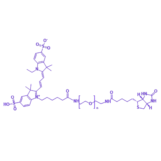 Cy3-PEG-Biotin是一种由Cy3荧光染料、聚乙二醇(PEG)及生物素(Biotin)共价连接而成的荧光生物素-PEG衍生物,兼具荧光标记、生物靶向及生物相容性等多重功能,适用于生物分子标记、特异性检测及成像分析等领域。 Cy3作为红色荧光染料,具有优异的光学性能:激发波长550nm,发射波长570nm,可产生强烈的红色荧光信号,确保实验检测中信号的高灵敏度捕捉;其良好的光稳定性可保障长时间实验或复杂光照条件下荧光特性不衰减,为生物成像提供清晰稳定的可视化指示。 PEG链的引入显著优化了化合物的理化性质:提升水溶性以实现水溶液体系中的均匀分散;增加分子柔性,增强其在复杂生物环境中的穿梭能力;凭借生物相容性降低非特异性结合,为精准生物标记奠定基础。 生物素片段通过与链霉亲和素或抗生物素蛋白的高亲和力相互作用,赋予该衍生物特异性识别与捕获目标生物分子的能力,在生物分子定位、分离及检测中发挥关键作用,可广泛应用于免疫分析、细胞成像及蛋白质组学研究等场景。