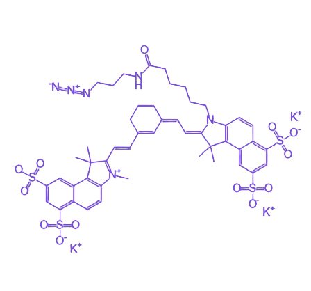 Sulfo CY7-N3 是一种兼具荧光标记功能与化学活性的复合型化合物,通过磺化修饰的CY7荧光基团与叠氮基团的协同作用,实现对生物分子的特异性标记及近红外荧光成像。其设计兼顾水溶性、光物理性能与化学反应活性,适用于复杂生物体系中的动态示踪与高分辨成像研究。