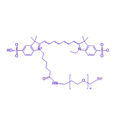 CY7-PEG-SH是一种整合了近红外荧光成像功能与生物偶联活性的聚乙二醇衍生物,通过将CY7荧光染料、PEG链段与巯基官能团进行分子设计,实现了光学示踪与生物分子修饰的双重特性,适用于生物医学成像及功能化材料制备领域。 CY7荧光基团赋予该衍生物优异的光学性能,其发射波长位于近红外光谱区域,具备深层组织穿透能力和低背景干扰特性,可有效降低生物样本自发荧光的影响,提升成像信噪比,满足活体成像、细胞追踪等高精度光学检测需求。 聚乙二醇(PEG)链段作为分子骨架,凭借其高生物相容性和亲水性,能够显著改善偶联物的水溶性,减少非特异性蛋白吸附,并延长其在生物体内的循环时间,降低免疫原性,为生物应用提供良好的生理环境适应性。 巯基(-SH)官能团具有高度化学反应活性,可通过硫硫键(-S-S-)形成或与马来酰亚胺、卤代化合物等发生特异性共价反应,实现与抗体、多肽、药物分子及纳米载体等生物活性物质的高效偶联,从而构建兼具靶向识别、药物递送与荧光示踪功能的多功能生物探针或治疗体系。