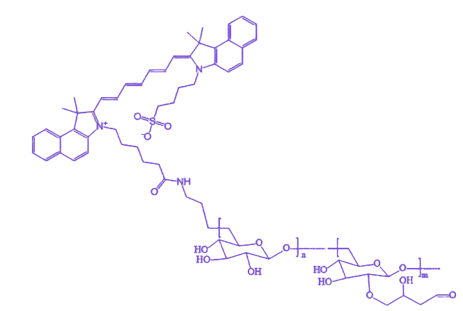 该共轭物的应用方向主要包括生物成像与药物递送:在成像领域,利用其近红外荧光特性可实现深层组织的高分辨率可视化;在药物递送领域,依托葡聚糖的载体功能,可对药物或生物活性分子进行包裹或连接,进而实现靶向运输与可控释放,为疾病诊疗提供创新解决方案。