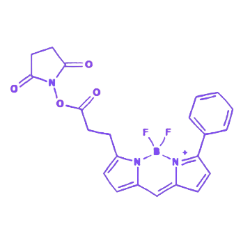 BDP R6G-NHS 是一款无需预活化的高效荧光标记染料,融合氟硼二吡咯(BDP)的高稳定性与罗丹明 6G(R6G)的高亮度荧光特性,凭借 NHS 酯基团的活性,成为生物分子氨基标记的理想工具。其 CAS 号 335193-70-9,分子式 C₂₂H₁₈BF₂N₃O₄,外观为橙红色固体,易溶于极性有机溶剂,需注意水相稳定性。 光学层面,该染料激发波长约 525 nm、发射波长约 545 nm,处于黄绿色荧光波段,适配常规荧光显微镜的 TRITC 通道;荧光量子产率高达 0.92,摩尔消光系数约 85,000 M⁻¹cm⁻¹,光稳定性远超传统罗丹明活性酯,可清晰捕捉目标分子动态。 化学结构上,NHS 酯基团能直接与生物分子的伯氨基(-NH₂)反应,形成稳定的酰胺键,无需额外添加活化剂(如 EDC),反应条件温和(pH 7.0-8.5、室温),且特异性强,不影响生物分子天然活性。 应用中,该染料可快速标记抗体用于免疫荧光定位,检测细胞表面抗原分布;标记多肽用于受体靶向成像;还可修饰氨基化纳米载体,实现药物递送的荧光示踪,为疾病机制研究、诊断试剂开发及药物研发提供便捷、高效的荧光标记方案。
