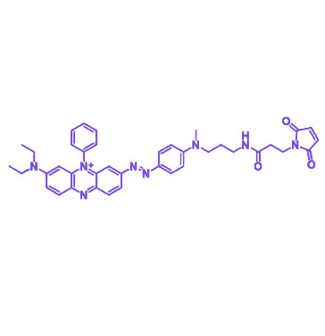 BHQ3-Mal是一种由BHQ-3暗猝灭剂核心与马来酰亚胺反应基团共价结合的非荧光淬灭试剂,主要应用于生物分子标记、荧光探针构建及生物成像领域。其作用机制基于荧光共振能量转移(FRET)和光致电子转移(PET)原理,通过非辐射方式高效吸收荧光团的激发态能量,从而显著抑制荧光信号发射。 该淬灭剂核心具有独特的多芳基偶氮结构,形成430–730 nm的宽谱吸收带,主吸收峰位于约672 nm,可特异性淬灭近红外荧光团(如Cy5、Cy5.5、Alexa Fluor 647)。马来酰亚胺基团作为高反应活性官能团,能与含巯基(-SH)的生物分子(如半胱氨酸残基、谷胱甘肽)发生特异性共价反应,生成稳定的硫醚键,实现对目标生物分子的高效标记。 产品核心优势包括:无自身荧光特性可有效降低背景信号,提升检测信噪比;宽光谱覆盖能力使其与近红外荧光团(如Cy5、ATTO 647N)形成理想FRET对,适用于深层组织成像研究;优异的耐光漂白性能保障其在长时间光照环境(如实时荧光检测、活体成像)中的稳定应用。