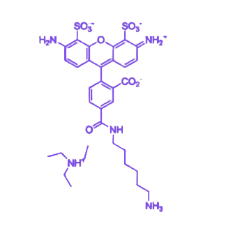 该试剂末端修饰的氨基(-NH2)具有高反应活性,可在缩合剂(如EDC/NHS)介导下与含羧基(-COOH)的生物分子高效偶联形成稳定酰胺键,也能在特定条件下与醛基、酮基发生反应,实现多类型生物分子的共价标记。这种多反应位点特性使其广泛适用于蛋白质、多肽、核酸、多糖等生物分子的荧光标记需求。