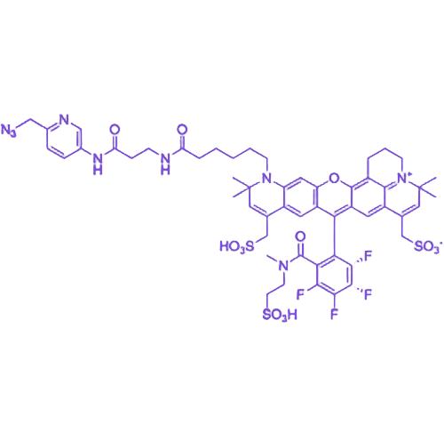 APDye633-Picolyl-N3是一种基于近红外荧光团的功能化染料,具备优异的光学性能、化学反应活性和生物兼容性,适用于生物分子标记与成像研究。其激发/发射峰位通常位于630–640 nm波段,发射光谱远离生物组织自发荧光区域,可在高背景或深层组织环境中提供良好成像对比度。 分子结构中引入吡啶甲基(Picolyl)和叠氮(–N₃)功能团,叠氮基团作为关键反应位点,为生物分子标记提供高选择性和高产率连接方式;吡啶甲基修饰可提升铜(I)催化“点击化学”反应效率,通过加快反应动力学和降低铜离子使用浓度,减少对生物体系的潜在毒性。产品兼具高亮度、良好水溶性和低背景特性,在保持高光稳定性的同时提升偶联效率,使标记反应在温和条件下进行,较大程度保留蛋白质、核酸或多肽等生物分子的结构与功能活性。 近红外发射特性使其可与其他可见光染料配合用于多重标记和体内成像实验,有效避免光谱重叠,提高数据准确性和可重复性。该染料特别适合对信噪比要求严格的免疫荧光、活细胞成像和体内分布追踪实验,已成为分子诊断、细胞信号通路研究、纳米探针标记和体内分布成像等前沿领域的重要工具,为复杂生物体系中的定量检测和动态监测提供可靠保障。