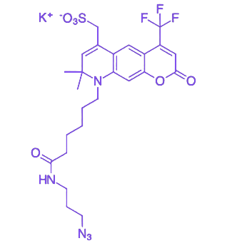 AF430-N3 是Alexa Fluor系列中一款专为生物正交化学设计的高性能荧光探针,具备优异的光学特性与生物相容性,适用于多种生物成像与标记场景。其Max激发波长约430纳米,发射峰值约540纳米的明亮黄绿色荧光,荧光量子产率高达0.8,可高效将吸收光能转化为荧光信号,确保标记物的高亮度表现。 该探针具有出色的光稳定性,在长时间或高强度光照条件下荧光信号不易淬灭,为活细胞成像、时间序列分析及高分辨率显微技术提供持续稳定的高信噪比成像效果。核心特征在于分子末端的叠氮基团(-N3),赋予其强大的生物正交反应活性,可与含炔基分子发生特异性点击化学反应。 其反应体系包括铜催化的叠氮-炔环加成反应(CuAAC),适用于固定后样品的高效标记;更支持无铜点击化学反应,如与环张力炔(如DBCO)进行的应变促进叠氮-炔环加成反应(SPAAC),避免重金属离子对活体细胞的潜在毒性,可直接应用于活体系统或铜敏感环境,拓展了在生物医学研究中的应用范围。