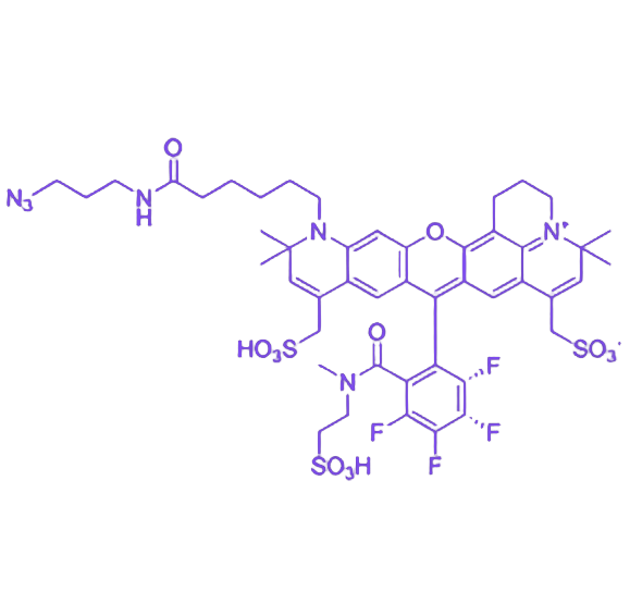 该染料发射波长约为633 nm,处于近红外光谱区,此特性使其在复杂生物体系中具备优异的组织穿透力,可有效降低自发荧光干扰,特别适合深层组织成像与高背景样品检测。分子结构中含有的叠氮(–N₃)官能团,能在Cu(I)催化条件下与炔基(–C≡CH)化合物发生特异性点击化学反应,实现与生物分子的快速、稳定偶联,且不影响目标分子原有生物活性。