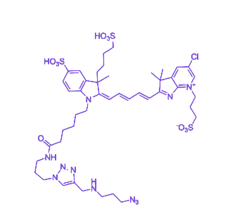 APDye680-N3-Plus(APDye680-叠氮化物增强型)是一款突破传统点击化学效率瓶颈的近红外荧光探针,其核心优势在于分子结构中内置的铜螯合系统,无需额外添加复杂催化配体即可在CuAAC反应中自组装活性铜复合物,显著提升叠氮-炔反应速率,尤其在稀释条件下仍能实现瞬时结合,有效解决低丰度靶标标记效率低的关键问题。该探针以深紫色粉末形态存在,分子量约962.13 g/mol,纯度≥95%,具备优异的光学性能与化学稳定性,是科研领域微量生物分子检测与高分辨率成像的理想工具。 光学特性方面,APDye680-N3-Plus的 extinction coefficient 达185,000 M⁻¹cm⁻¹,荧光量子产率高,激发/发射波长分别为678 nm/701 nm,处于生物组织自发荧光极低的“光学窗口”,信噪比相比普通APDye680-N3显著提升,确保成像结果的高灵敏度与清晰度。 化学性能上实现多重突破:溶解性达成水油双溶,可直接用水配制工作液,无需助溶剂,有效降低细胞毒性;反应体系凭借自组装铜复合物设计,实现高效点击化学反应,尤其适用于低丰度靶标标记场景。 储存与稳定性方面,该探针需在避光、-20℃干燥环境下储存,粉末形态可稳定保存2年;溶液经分装后于-80℃条件下可保存3个月,确保长期实验使用的可靠性。 应用范围覆盖固定细胞、组织切片及活细胞标记(需严格控制铜离子浓度),其高效反应性与高灵敏度使其在蛋白质组学、细胞生物学及分子影像学等研究领域具有广泛应用前景。