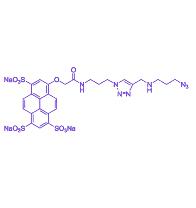 Pyrene Azide Plus 是一种集高亮度荧光特性与高效反应活性于一体的功能性探针,其核心结构包含 Pyrene 荧光团与末端 叠氮(Azide)基团。该探针凭借 Pyrene 对环境极性的高敏感性及叠氮基团的 Click 化学反应活性,广泛适用于生物分子标记、相互作用研究及材料功能化修饰等领域,在生物化学、分子生物学及材料科学中具有重要应用价值。 Pyrene 荧光团具备 高量子产率与 长荧光寿命,其荧光信号对分子环境极性变化高度敏感,可实时监测蛋白质构象转变、分子自组装过程及微环境极性差异。末端 Azide 基团在温和条件下展现出优异的反应活性,可高效参与 铜催化炔烃-叠氮环加成(CuAAC)和 应变促进炔烃-叠氮环加成(SPAAC)等 Click 化学反应,实现与炔烃修饰分子的特异性共价偶联,确保标记过程的高效性与选择性。 探针化学性质稳定,可溶解于 DMSO、DMF 或水相缓冲体系,通过 PEG 或其他疏水性修饰可进一步优化其在复杂体系中的溶解性与分散性。典型应用包括蛋白质/肽链的特异性荧光标记、分子间相互作用的可视化研究、膜蛋白动态行为分析、荧光传感器构建及功能性纳米材料表面修饰。通过 Azide 端的共价偶联与 Pyrene 荧光信号的协同作用,该探针能在复杂生物或材料体系中保持高选择性与检测可靠性。 产品需储存于 低温、干燥、避光环境,以防止光降解及 Azide 基团失活。操作时应避免接触强酸、强碱及强氧化剂,确保化学活性与荧光性能稳定。使用前建议溶解于 DMSO 或缓冲体系中进行 Click 偶联或荧光标记操作,溶解后宜尽快使用以保证反应效率,长期储存条件下仍可保持良好的化学稳定性。