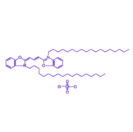 DiO 分子由两个吲哚环通过次甲基桥连接构成,其中一个吲哚环携带长链十八烷基,赋予分子亲脂性,使其能与生物膜等脂质环境稳定结合;吲哚环与次甲基桥形成的共轭体系是荧光产生的结构基础,决定了其特定的吸收与发射光谱;分子中的四甲基基团则通过影响空间构型与电子云分布,进一步调控光学性质与化学稳定性。