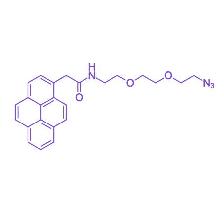 Pyrene Azide 2是一类融合pyrene优异光学性能与azide高反应活性的功能性荧光探针,其化学结构赋予材料在生物标记与分析领域的独特优势。该探针通过Click化学(CuAAC)实现高效偶联,同时利用pyrene荧光特性的环境敏感性,广泛适用于生物化学、材料科学及纳米技术等多学科研究场景。 pyrene作为核心荧光团,具备高量子产率、长荧光寿命及微环境响应特性,可通过单体与二聚体荧光比值动态反映分子间相互作用或构象变化,为蛋白质构象研究、分子识别及微环境极性检测提供可视化分析手段。azide官能团则在铜催化条件下与末端炔基发生高特异性CuAAC反应,生成稳定的1,2,3-三唑环结构,该反应条件温和且兼容水相/有机相体系,确保对蛋白质、肽链、小分子及材料表面的精准标记。 在应用层面,Pyrene Azide 2可实现蛋白质/肽链荧光标记、膜蛋白动态追踪、分子自组装过程监测及荧光传感器开发,其与PEG链等修饰结构的结合能有效提升水相分散性并降低非特异性吸附,保障荧光信号的稳定性与检测灵敏度。 产品需储存于低温、干燥、避光环境以防止光降解及azide基团分解,使用时建议溶解于DMSO、DMF等无水有机溶剂后再分散于水相缓冲体系。Click反应推荐在中性缓冲条件下进行,并需添加适量铜催化剂与还原剂,操作中应规避强酸、强碱及氧化性环境,以维持探针的化学活性与光学性能。