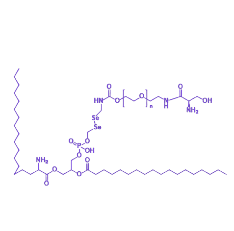 CY5.5作为核心荧光模块,提供近红外波段的强烈荧光信号,具备高组织穿透深度和低背景干扰特性,满足体内外生物成像与动态追踪需求。DSPE磷脂结构赋予分子优良的生物相容性,可通过细胞膜融合机制高效穿透磷脂双分子层,实现细胞内靶向递送。硒-硒(Se-Se)键作为ROS响应开关,在活性氧微环境中发生氧化断裂,触发负载分子的控释或荧光信号变化,适用于氧化应激相关疾病的靶向诊疗研究。PEG链段显著提升分子水溶性与胶体稳定性,降低非特异性蛋白吸附,延长体内循环时间。丝氨酸(Serine) 残基引入氨基酸功能性位点,可通过氢键、静电作用增强生物分子相互作用,潜在参与细胞代谢调节及蛋白质合成相关的生物学过程。